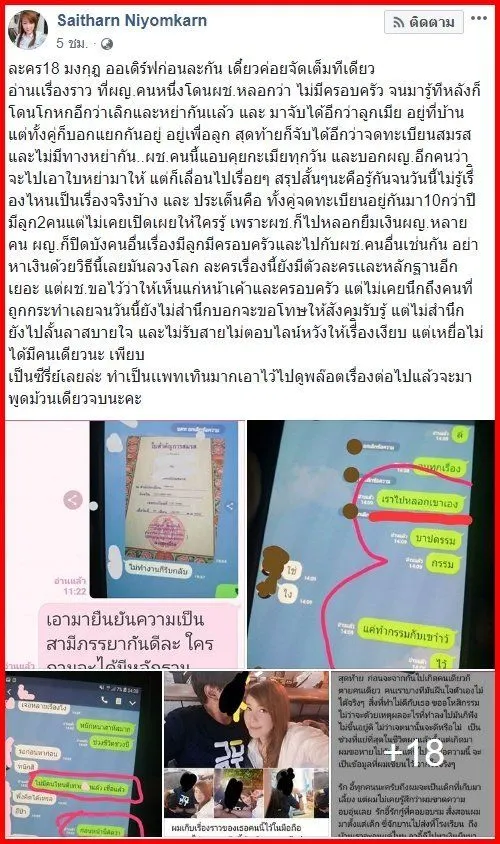ผช.คนนี้แอบคุยกะเมียทุกวัน และบอกผญ.อีกคนว่าจะไปเอาใบหย่ามาให้ แต่ก็เลื่อนไปเรื่อยๆ สรุปสั้นๆนะคือรู้กันจนวันนี้ไม่รู้เรื่องไหนเป็นเรื่องจริงบ้าง และ ประเด็นคือ ทั้งคู่จดทะเบียนอยู่กันมา10กว่าปีมีลูก2คนแต่ไม่เคยเปิดเผยให้ใครรู้ เพราะผช.ก็ไปหลอกยืมเงินผญ.หลายคน