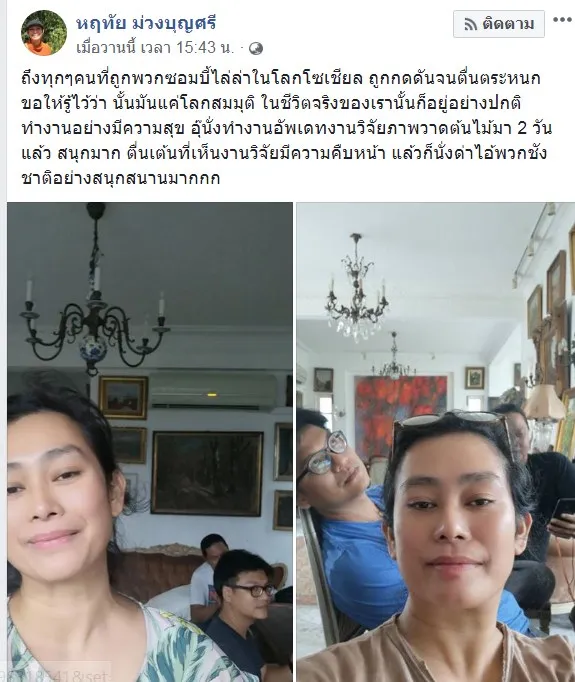 ล่าสุดโพสต์ "ถึงทุกๆคนที่ถูกพวกซอมบี้ไล่ล่าในโลกโซเชียล ถูกกดดันจนตื่นตระหนก ขอให้รู้ไว้ว่า นั้นมันแค่โลกสมมุติ ในชีวิตจริงของเรานั้นก็อยู่อย่างปกติ ทำงานอย่างมีความสุข อุ๊นั่งทำงานอัพเดทงานวิจัยภาพวาดต้นไม้มา 2 วันแล้ว สนุกมาก ตื่นเต้นที่เห็นงานวิจัยมีความคืบหน้า แล้วก็นั่งด่าไอ้พวกชังชาติอย่างสนุกสนานมากกก "