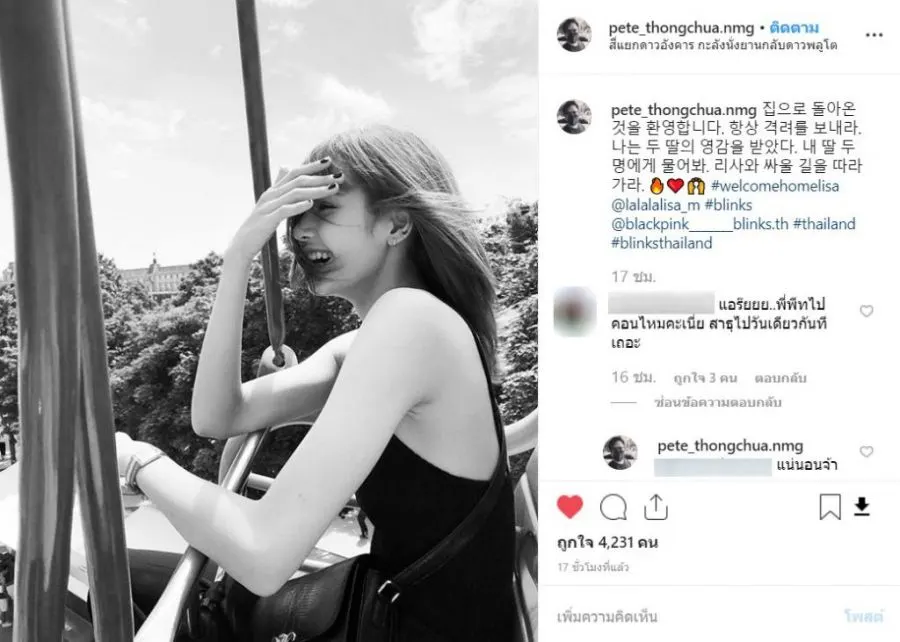 งานนี้ พระเอกหนุ่มรุ่นใหญ่อย่าง พีท ทองเจือ ก็ได้โพสต์ต้อนรับลิซ่ากลับบ้าน พร้อมกับบอกเลยว่าเป็นกำลังใจให้ลิซ่าเสมอ