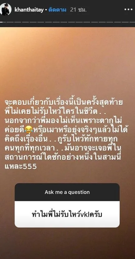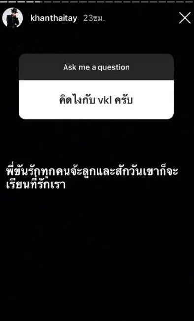 ซึ่งประเด็นดังกล่าวนั้นขัน ไม่เคยออกมาตอบหรือพูดถึงประเด็นนี้สักที จนล่าสุดได้มีคนเข้าไปตั้งคำถามในไอจีของหนุ่มขันว่า ทำไมพี่ไม่รับไหว้วีเคแอลครับ ซึ่งหนุ่มขันก็ได้ออกมาตอบคำถามนี้ว่า จะตอบเกี่ยวกับเรื่องนี้เป็นครั้งสุดท้ายพี่ไม่เคยไม่รับไหว้ใครในชีวิต นอกจากว่าพี่มองไม่ค่อยเห็นเพราะตาxไม่ค่อยดี หรือเมาหรือยุ่งจริงๆ แล้วไม่ได้คิดถึงเรื่องอื่น xรับไหว้ทักทายทุกคนทุกที่ทุกเวลา มันอาจจะเจอพี่ในสถานการณ์ใดซักอย่างหนึ่งในสามนี่แหละ555