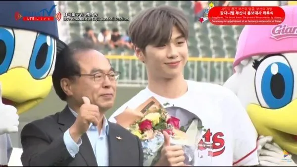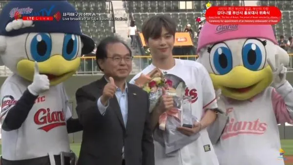 พิธีแต่งตั้งคังแดเนียลเป็นทูตประชาสัมพันธ์ของปูซานนั้นผ่านไปด้วยดี คังแดเนียลได้รับโล่และดอกไม้ในฐานะที่ได้รับตำแหน่งอันทรงเกียรติ ก่อนจะออกมาสวมวิญญาณพิชเชอร์ขว้างลูกเบสบอลเปิดสนาม บอกเลยว่าคังแดเนียลกับเสื้อทีมเบสบอลของ Lotte Giants เป็นอะไรที่ดีงามมากค่ะคุณ ยิ่งเห็นลีลาการขว้างลูกแล้ว สวยงาม บอดี้เป๊ะ ขว้างลูกไกล สมกับที่เป็นไอดอลหนุ่มหุ่นดีมีซิกส์แพ็กจริงๆ (รองเท้าที่ใส่ก็แพงมาก ราคาตอนนี้คู่ละแสนกว่าบาทเอ๊ง)