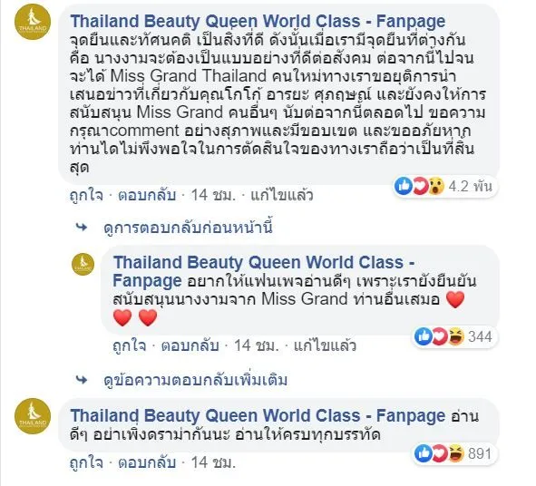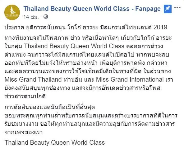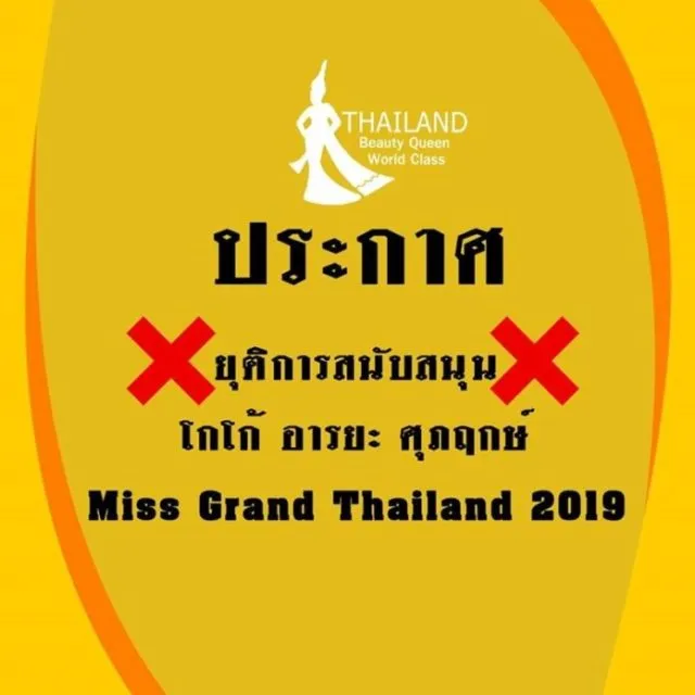 เกี่ยวกับกรณีดังกล่าว ล่าสุด (15 ก.ค.) เฟซบุ๊กแฟนเพจ Thailand Beauty Queen World Class – Fanpage ได้โพสต์ข้อความระบุว่า “ประกาศ ยุติการสนับสนุน โกโก้ อารยะ มิสแกรนด์ไทยแลนด์ 2019 ทางทีมงานจะไม่โพสต์ภาพ ข่าว หรือเนื้อหาใด ๆ เกี่ยวกับ โกโก้ อารยะ ในกลุ่ม Thailand Beauty Queen World Class ตลอดการดำรงตำแหน่ง จนกว่าจะได้มิสแกรนด์ไทยแลนด์ในปีต่อไป หากพบจะลบออกทันทีโดยไม่แจ้งให้ทราบล่วงหน้า เพื่อยุติการพาดพิง กล่าวหา และลดความรุนแรงของการใช้โซเชียลมีเดียในทางที่ผิด ในส่วนของ Miss Grand Thailand ท่านอื่น และ Miss Grand International เรายังคงสนับสนุนทุกช่องทาง และจะมีการอัพเดตข่าวสารหรือโพสต์ข่าวสารตามปกต การตัดสินของแอดมินถือเป็นที่สิ้นสุด ขอบพระคุณทุกท่านสำหรับการสนับสนุนและสร้างบรรยากาศที่ดีในการรับชมนางงาม ขอให้ทุกท่านสนุกและมีความสุขกับการติดตามข่าวสารจากเพจของเรา Thailand Beauty Queen World Class“