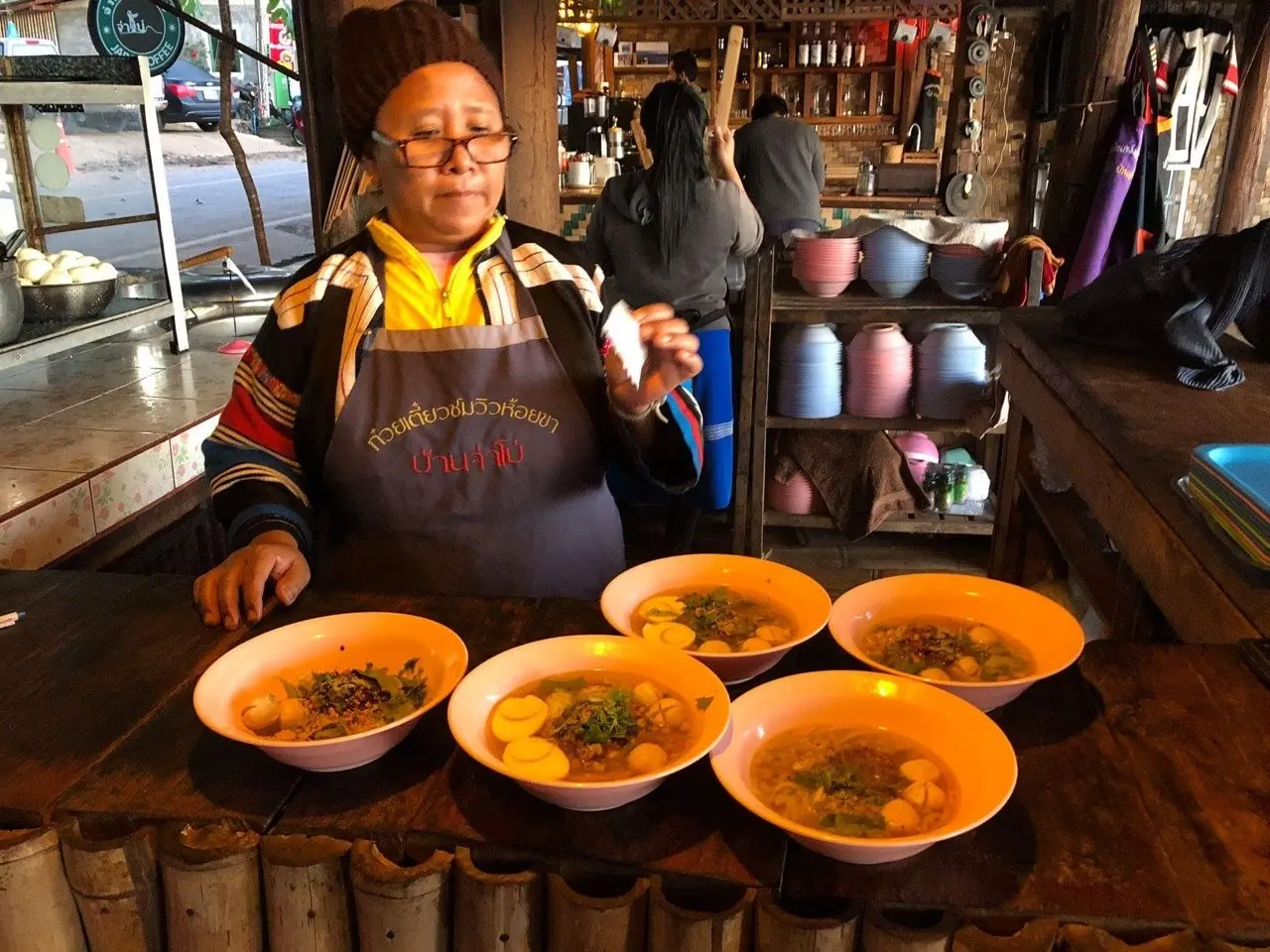 แลนด์ มาร์ค ที่ขึ้นชื่ออีกแห่งหนึ่งของปางมะผ้าคือ ร้านก๊วยเตี๋ยวห้อยขาที่บ้านจ่าโบ่