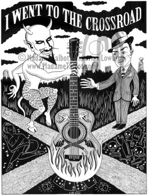 ผู้เฒ่าเล่าขานกันว่า เมื่อ Robert Johnson ยังเป็นหนุ่มน้อย อาศัยอยู่ในโรงเก็บนุ่นชนบทใน Mississippi เขารักที่จะเล่นกีตาร์มาก แต่ฝีมือไม่โดดเด่น วันหนึ่งมีคนมาบอกให้เขาเอากีตาร์ไปยืนที่สี่แยกใกล้ๆ โรงงานชื่อ Dockery ตอนเที่ยงคืน ที่นั่นเวลานั้นเขาจะได้พบกับปิศาจ ผู้ที่จะนำกีตาร์ของเขาไปปรับให้เล่นเพลงออกมาอย่างไรก็ได้ตามใจปรารถนา แต่มีข้อแม้ว่าเขาต้องมอบวิญญาณให้กับปิศาจไป ตำนานไม่ได้กล่าวไว้ว่าเขาไปหรือไม่ เพราะไม่มีใครเห็น แต่ผ่านไปไม่ถึงปี เขากลับมาพร้อมลีลาร้อง เล่น แต่ง ดนตรีบลูส์ได้ชนิดหาที่ติไม่เจอ พร้อมกับขับขานเสียงเพลงบลูส์ที่ไพเราะที่สุด เท่าที่มีคนเคยได้ยินมา