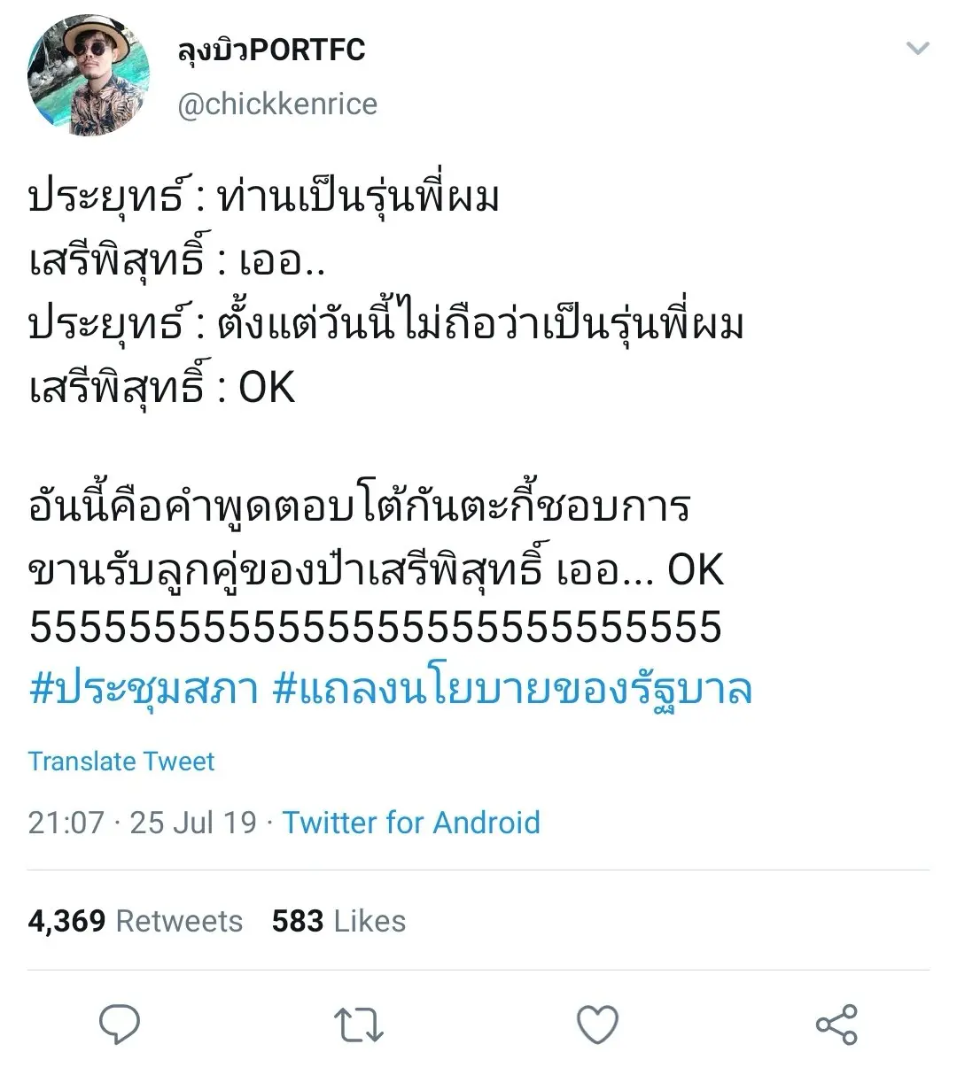 ทั้งนี้ยืนยันว่าไม่มีการเข้าไปคุยกันเป็นการส่วนตัวในตอนพักการประชุม และตนจะไม่คุย เพราะคุยไม่รู้เรื่อง นายกรัฐมนตรีเคยตัวเสียแล้วกับการสั่งการซ้ายหันขวาหัน แล้วจะมาสั่งตนได้อย่างไร ตนจะไม่เคลียร์ และพรุ่งนี้จะแถลงอีก 2 ประเด็นคือ นโยบายที่แถลงวันนี้ขัดรัฐธรรมนูญ และ ครม. แถลงนโยบายวันนี้ไม่มีอำนาจ วันนี้ตนจะกลับบ้านก่อน เพราะวันนี้ถ้าตนจะมาขออภิปรายใหม่ก็จะมีคนเหม็นหน้า โดยเฉพาะประธานที่เคยเป็นประธาน สนช. ที่มาเป็น ส.ว. ต่อ ก็ไม่เป็นกลางมาตลอด ในห้องประชุมก็ไม่เป็นกลาง