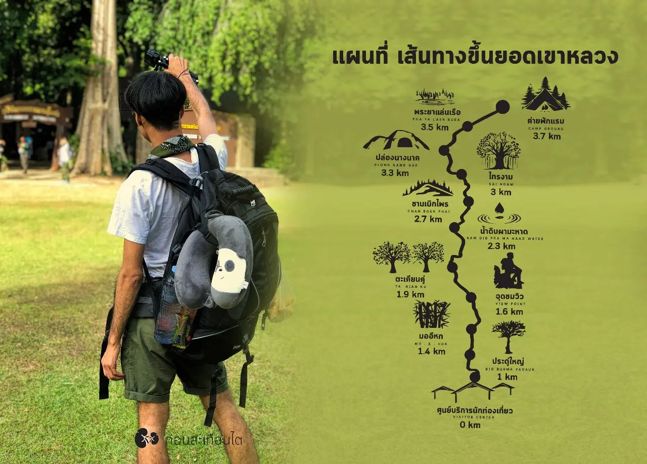 ระยะทางสำหรับเส้นทางพิชิตเขาหลวง จากที่ทำการศูนย์บริการนักท่องเที่ยว ไปจนถึงยอดเขานั้นเป็นระยะทางโดยประมาณ 3.7 กิโลเมตร ครับ โดยจะผ่านสถานที่สำคัญต่างๆ เริ่มตั้งแต่ ประดู่ใหญ่ มออีหก จุดชมวิว ตะเคียนคู่ น้ำดิบผามะหาด ชานเบิกไพร ไทรงาม ปล่องนางนาง และพระยาแล่นเรือครับ ซึ่งแต่ละที่ก็มีประวัติความเป็นมาที่น่าสนใจ สามารถแวะพักชมและถ่ายรูปเก็บไว้เป็นที่ระลึกได้ครับ รวมถึงในแต่ละสถานที่ก็เป็นเสมือนเครื่องหมายบอกระยะทางครับว่าเราได้เดินมากี่กิโลเมตร