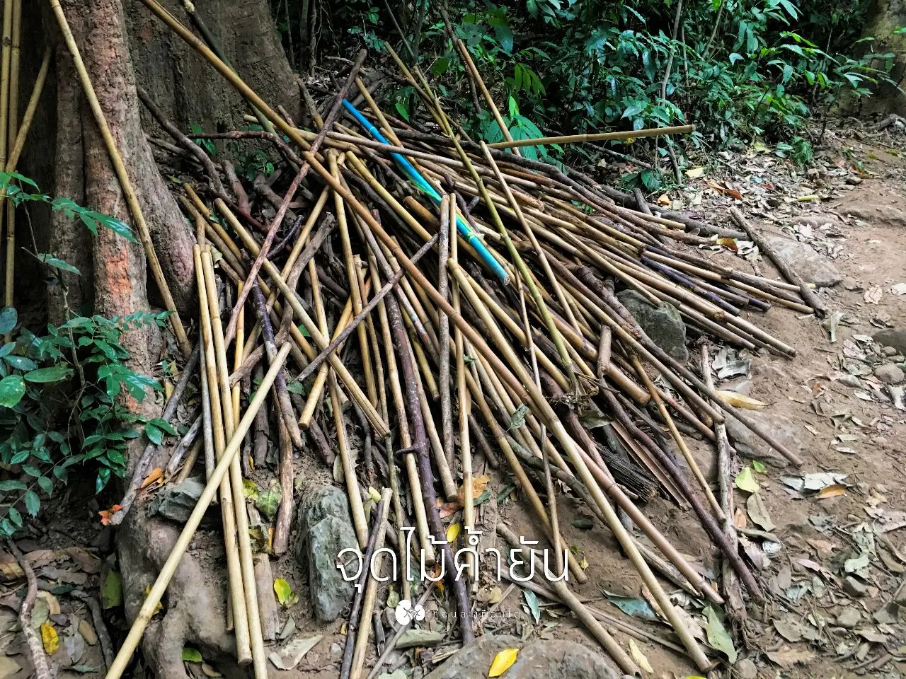 เมื่อเราเดินเข้ามาได้สักพักที่ราวๆ 150 เมตร ก็จะพบกับจุดกองไม้ค้ำยัน หรือไม้เท้าเดินป่าครับ ซึ่งไม้ค้ำยันเหล่านี้มีประโยชน์และมีความสำคัญมากครับสำหรับการเดินเขาของพวกเรา