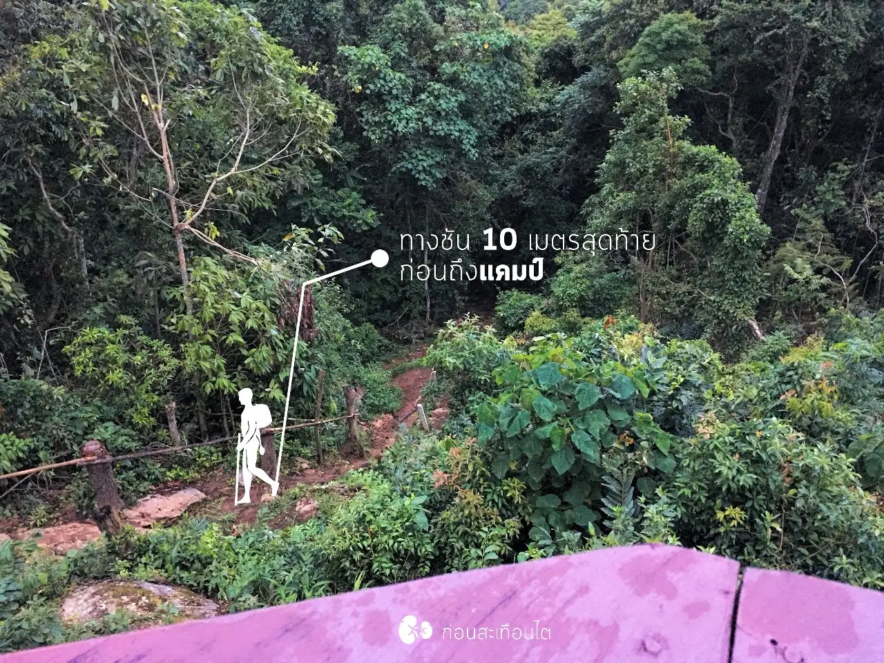 จุดนี้เป็นทางชัน 10 เมตรสุดท้ายแล้วครับก่อนที่จะถึงยอดเขาหลวงและจุดตั้งแคมป์ในจุดหมายปลายทางของเรา แต่เชื่อมั้ยครับว่ามาเป็นช่วงเวลาที่ยากลำบากที่สุด เพราะเนื่องจากเดินมาเป็นระยะเวลาที่ยาวนาน บวกทางที่สูงชัน 10 เมตรสุดท้ายก็แทบจะไม่ทำให้รู้สึกว่าอยากจะรีบๆปีนขึ้นไปให้ถึง ผมเกาะราวอยู่ต้องนั้นนานพอสมควร นานพอแทบจะตั้งแคมป์อยู่ตรงนั้นแทนเลยทีเดียว 555+ แต่ด้วยความที่เห็นมีผู้ชายแอบถ่ายภาพจากจุดพักที่ยื่นออกมา เลยกลัวเขาจะหาว่าเราอ่อนแอจัง เกือบจะถึงอยู่ละแต่ทำไมไม่ยอมเดินขึ้นมาอีก ก็เลยใช้พลังเฮือกสุดท้ายและพยายามพยุงร่างนี้ขึ้นมาจนถึงยอดเขา จุดตั้งแคมป์ได้ในที่สุดครับ