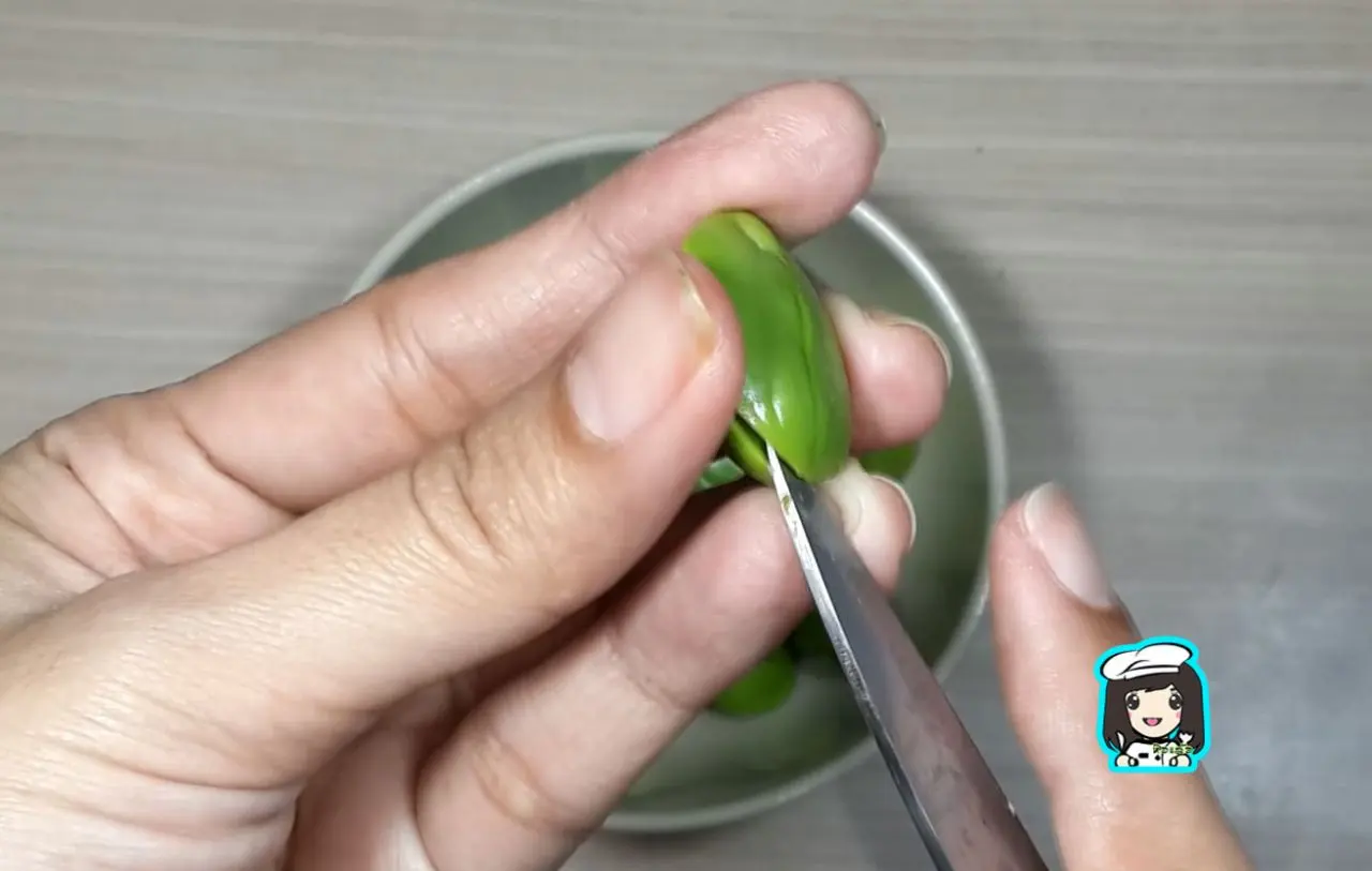 1.เกาะเปลือกสะตอ ใช้ปลายมีดแบ่งครึ่งตามรอยของเม็ดสะตอ เตรียมไว้