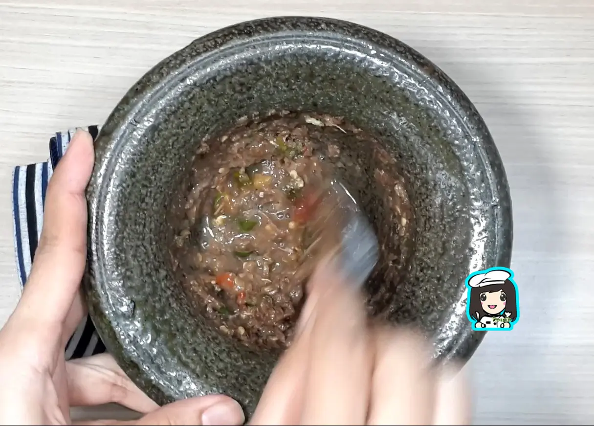 2.โขลกกระเทียมกับกะปิให้เนียนไปเนื้อเดียวกัน ตามด้วยพริกขี้หนูสวนโขลกต่อ ปรุงรสด้วยน้ำตาลปี๊บ น้ำปลา น้ำมะนาว (*ปริมาณน้ำปลาที่ใส่ขึ้นอยู่กับความเค็มของกะปิด้วย)