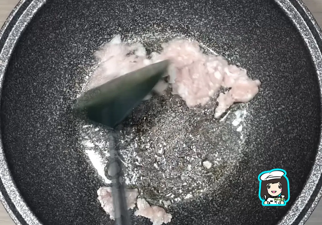 3.ตั้งกระทะใส่น้ำมันพืช ตามด้วยหมูสับผัดพอให้เริ่มเปลี่ยนสี ยีกระจายไม่ให้หมูสับเป็นก้อน