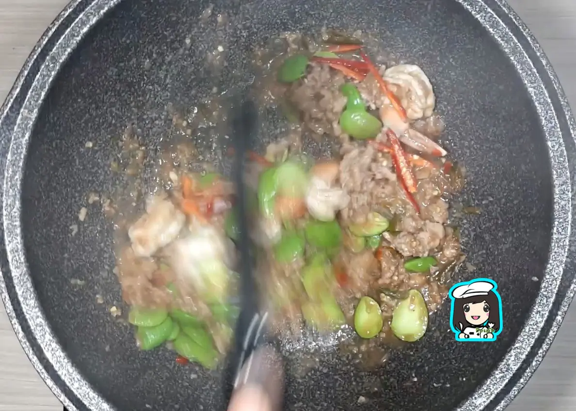 4.ใส่กุ้งสดและเม็ดสะตอ เพิ่มซีอิ้วขาว น้ำมันหอย
