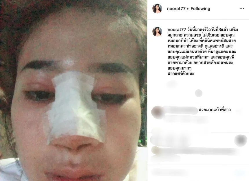 โดย หนูรัตน์ เผยถึงการศัลยกรรมจมูกไว้ว่า "วันนี้มาลงรีวิววันที่ 3 แล้ว เสริมจมูกสวย ความสวย ไม่เจ็บเลย ขอบคุณหมอนกที่ทำให้คะ ที่คลินิคแพทย์สมชาย หมอนกคะ ทำอย่างดี ดูแลอย่างดี และขอบคุณแม่แอนนาด้วย ที่มาดูแลคะ และขอบคุณแม่หมวยที่มาหา และขอบคุณพี่ชายพามาด้วย อยากสวยต้องอดทนคะ ขอบคุณมากๆ ฝากแชร์ด้วยนะ"