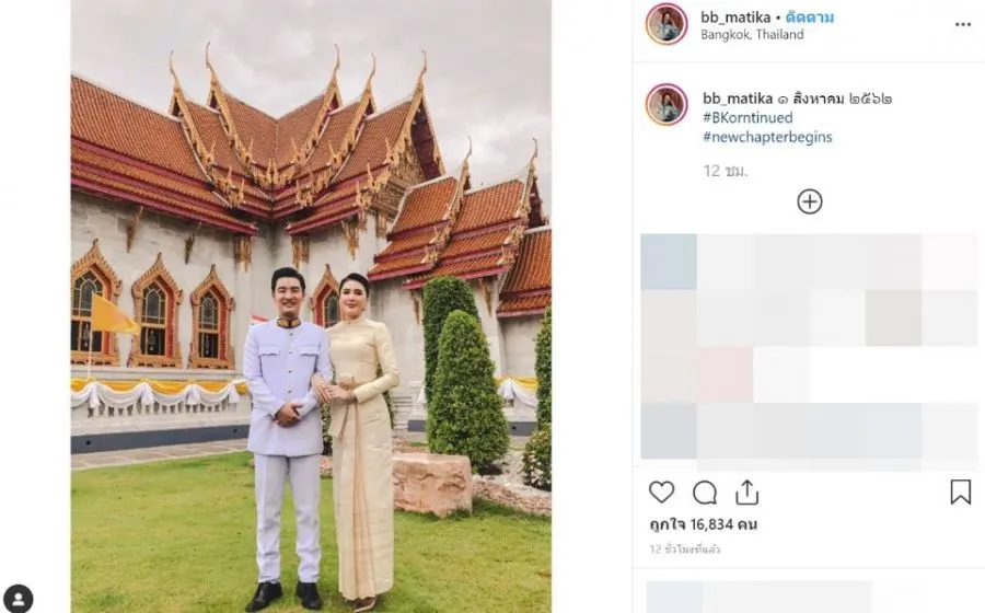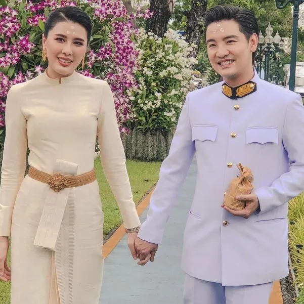 ล่าสุด ทั้งคู่ได้จูงมือกันเข้ารับพระราชทานน้ำสังข์เป็นที่เรียบร้อยแล้ว โดยแชร์ภาพขณะอยู่ในชุดไทย พร้อมกับถ่ายภาพที่บริเวณพระบรมมหาราชวัง ซึ่งคาดว่าถ่ายทำหลังเสร็จสิ้นพิธี ทำเอาเพื่อนดารา เข้ามาแสดงความเห็นเป็นจำนวนมาก