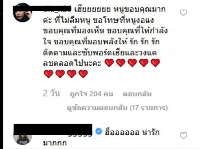“เฮีย หนูขอบคุณมากค่ะ ที่ไม่ลืมหนู ขอโทษที่หนูงอแง ขอบคุณที่มองเห็น ขอบคุณที่ให้กำลังใจ ขอบคุณที่มอบพลังให้ รัก รัก รัก ติดตามและซับพอร์ตเฮียและวงแคลชตลอดไปนะคะ”