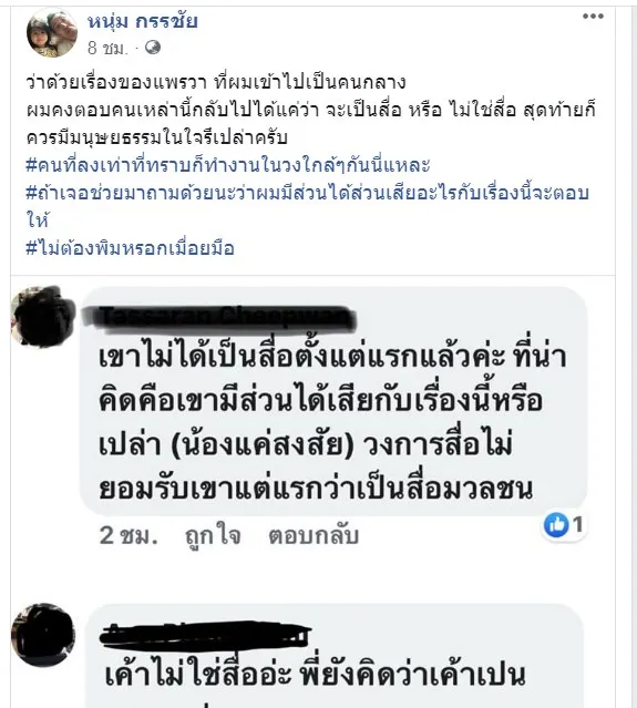 ด้าน หนุ่ม กรรชัย โพสต์แจงในแฟนเพจว่า ..."ว่าด้วยเรื่องของแพรวา ที่ผมเข้าไปเป็นคนกลาง