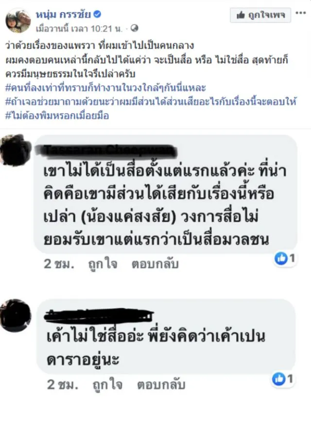 ล่าสุดหนุ่ม กรรชัย ทนไม่ไหวได้ออกมาโพสต์ถึงกรณีดังกล่าวโดยได้โพสต์เดือดว่า ว่าด้วยเรื่องของแพรวา ที่ผมเข้าไปเป็นคนกลาง ผมคงตอบคนเหล่านี้กลับไปได้แค่ว่าจะเป็นสื่อ หรือ ไม่ใช่สื่อสุดท้ายก็ควรมีมนุษยธรรมในใจรึเปล่าครับ #คนที่ลงเท่าที่ทราบก็ทำงานในวงใกล้ๆกันนี่แหละ#ถ้าเจอช่วยมาถามด้วยนะว่าผมมีส่วนได้ส่วนเสียอะไรกับเรื่องนี้จะตอบให้#ไม่ต้องพิมหรอกเมื่อยมือ