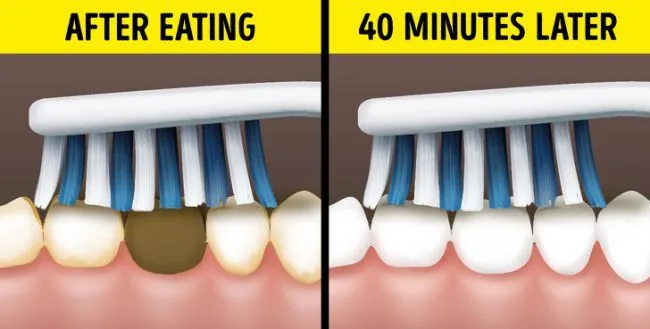 การแปรงฟันทันทีหลังจากรับประทานอาหารอาจดูเหมือนวิธีที่ดีที่สุดในการล้างเศษอาหารออกจากปากของคุณ แต่ไม่ใช่ เพราะอาหารหลายอย่างที่เรากินหรือดื่มนั้นมีกรด (อย่างมะเขือเทศ มะนาว น้ำส้ม ฯลฯ ) การแปรงฟันในทันทีอาจทำให้กรดในอาหารกร่อนเคลือบฟันของคุณและทำให้ฟันกัดกร่อน รอประมาณ 30 นาทีหลังมื้ออาหารก่อนใช้แปรงสีฟัน