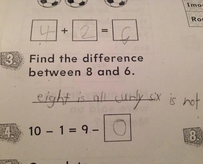 10 ให้หาความแตกต่างระหว่าง 8 กับ 6 เด็กน้อยตอบได้ถูกสุดๆ ว่าเลข 8 มันโค้งทั้งหมด แต่เลข 6 ไม่ได้เป็นอย่างนั้น