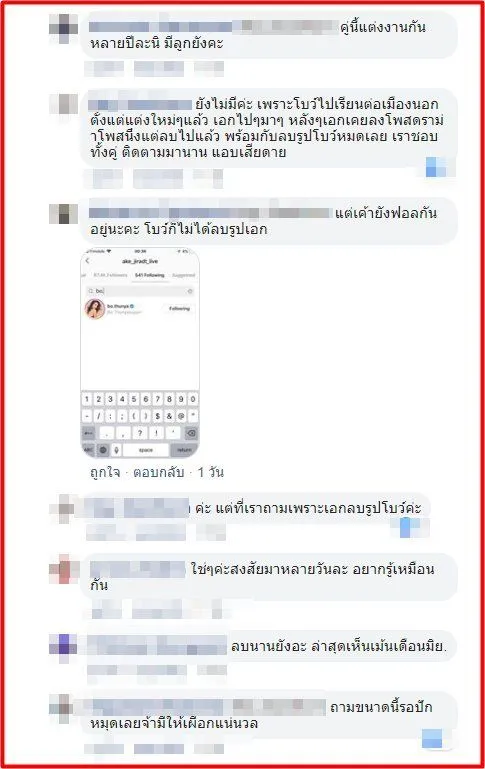 อะไรยังไงคะเนี่ย เมื่อเพจ เจ๊มอย 108 เม้าข่าวดาราคู่อื่นอยู่ดีๆ แต่ชาวเน็ตกลับสร้างประเด็น เปิดเผือกร้อนๆ จานใหม่ถึงที่ ด้วยสงสัยว่า “โบ ธัญญะสุภางค์” กับ “เอก เด็กวัดร้อยล้าน” จะเลิกกันแล้วหรือเปล่า โดยให้ข้อมูลว่า ด้านฝ่ายชาย ลบภาพฝ่ายหญิงเกลี้ยงอินสตาแกรมเลย อีกทั้งยังมักเห็นฝ่ายชายไปไหนมาไหนคนเดียว แถมยังบอกด้วยว่า ก่อนลบภาพภรรยาสาวจนหมด ฝ่ายชายโพสต์ดราม่าและลบไป