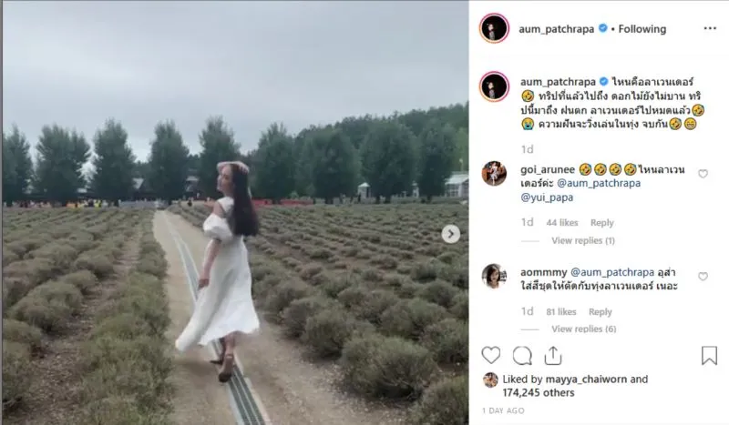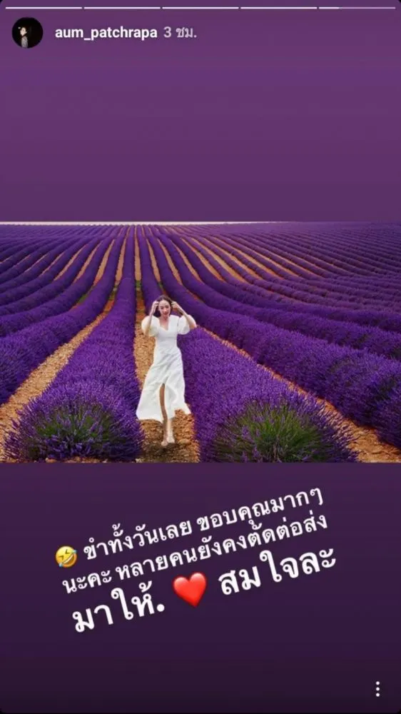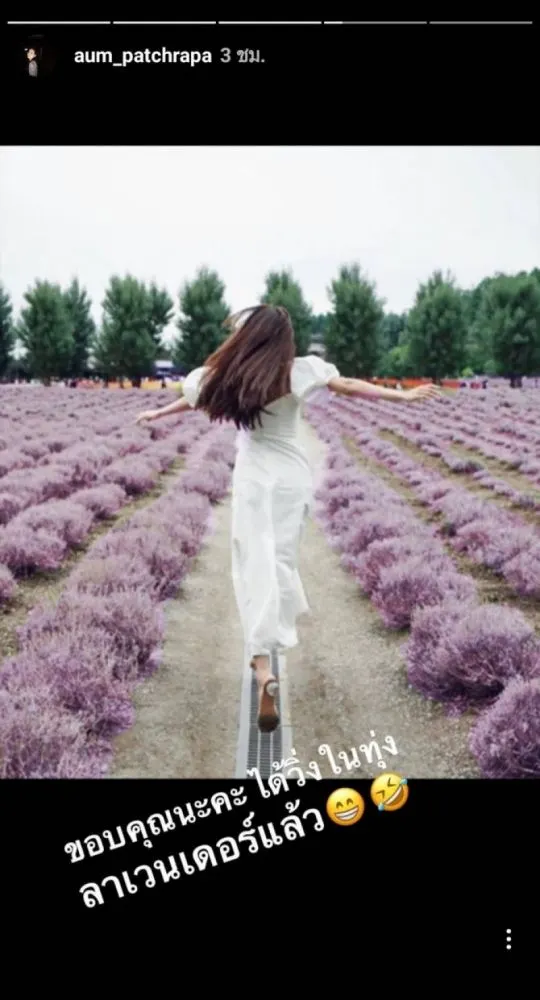 ซึ่งหนึ่งในสถานที่ที่ อั้ม พัชราภา ได้คาดหวังไว้ว่าจะไปโพสท่าถ่ายรูปสวยๆ นั่นก็คือทุ่งลาเวนเดอร์ที่ต้องตลบอบอวลไปกับสีม่วง ด้วยการมองเห็นความสวยอลังการจากทุกมุมของกล้อง
