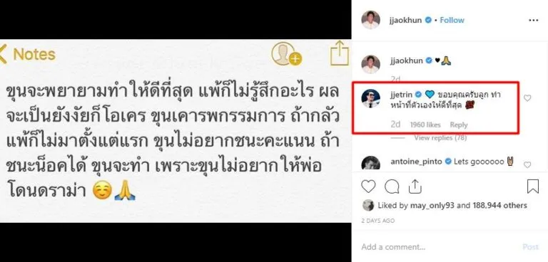 โพสต์เจ้าขุนระบุว่า ขุนจะพยายามทำให้ดีที่สุด แพ้ก็ไม่รู้สึกอะไร ผลจะเป็นยังไงก็โอเคร ขุนเคารพกรรมการ ถ้ากลัวแพ้ก็ไม่มาตั้งแต่แรก ขุนไม่อยากชนะคะแนน ถ้าชนะน็อคได้ ขุนจะทำ เพราะขุนไม่อยากให้พ่อโดนดราม่า จนพ่อเจต้องเข้ามาคอมเม้นต์ ขอบคุณ