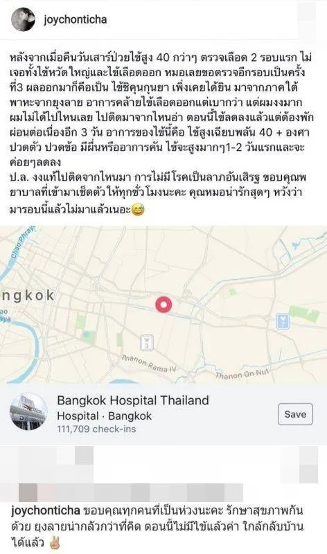 เจ้าตัวเผยว่า “หลังจากเมื่อคืนวันเสาร์ป่วยไข้สูง 40 กว่าๆ ตรวจเลือด 2 รอบแรก ไม่เจอทั้งไข้หวัดใหญ่และไข้เลือดออก หมอเลยขอตรวจอีกรอบเป็นครั้งที่ 3 ผลออกมาคือเป็น ไข้ชิคุนกุนยา เพิ่งเคยได้ยิน มาจากภาคใต้พาหะจากยุงลาย อาการคล้ายไข้เลือดออกแต่เบากว่า แต่ผมงงมาก ผมไม่ได้ไปไหนเลย ไปติดมาจากไหนอ่า ตอนนี้ไข้ลดลงแล้วแต่ต้องพักผ่อนต่อเนื่องอีก 3 วัน