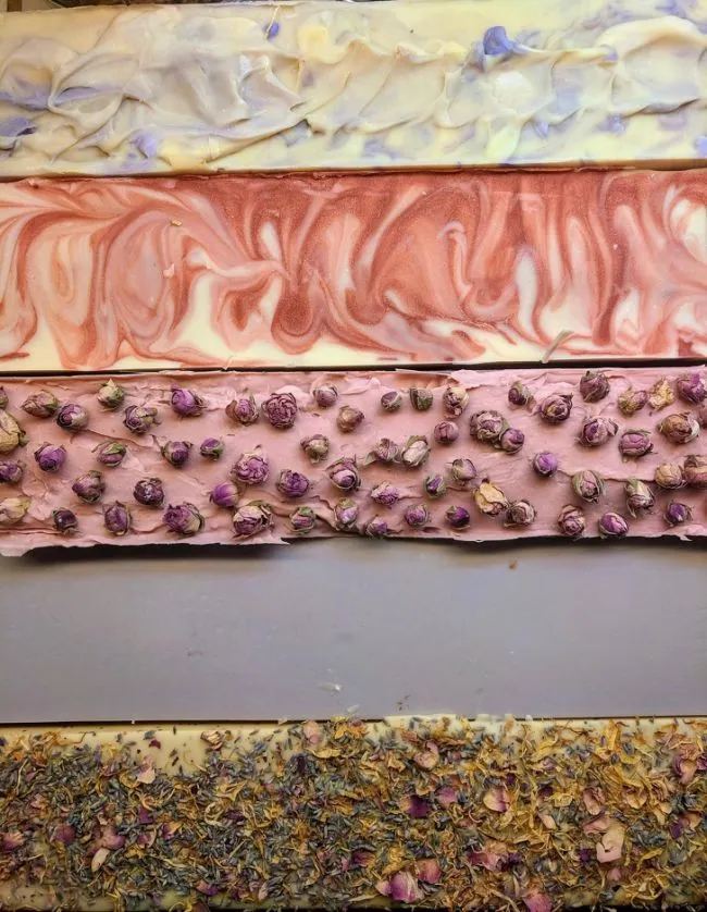 ก่อนที่จะถูกตัดเป็นแท่งหรือเป็นก้อน สบู่จะมีรูปร่างเป็นเช่นนี้
