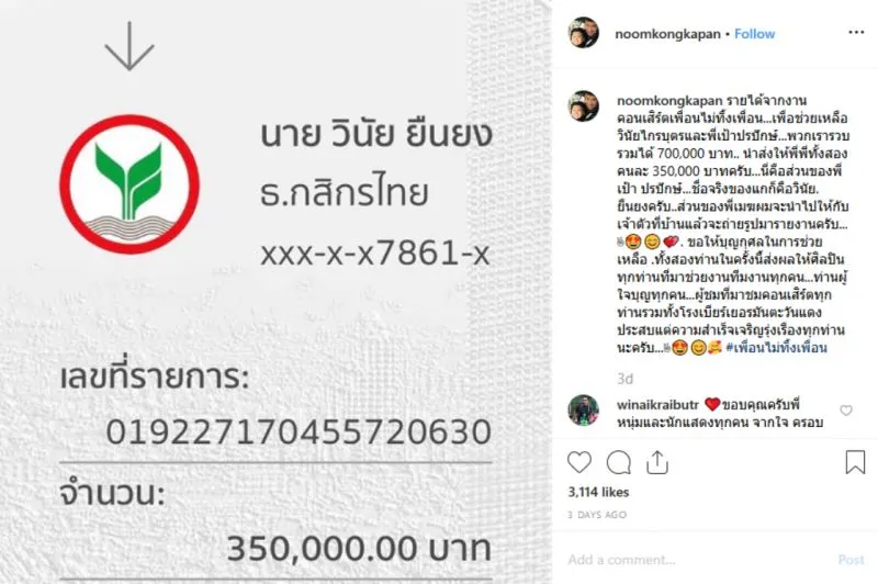 และทางด้าน หนุ่ม คงกระพัน ได้ออกมาเปดเผยยอดบริจาคจากการแสดงคอนเสิร์ตซึ่งรวมเป็นเงินจำนานกว่า 700,000 บาท โดยได้แบ่งเป็น 2 ส่วน ส่วนหนึ่งแบ่งให้กับ เมฆ วินัย เป็นเงินจำนวนเงิน 350,000 บาท และอีกส่วนให้กับ เป้า ปรปักษ์ เป็นจำนวนเงิน 350,000 บาท
