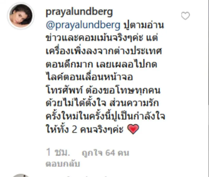 และยังได้ระบุว่า ปูตามอ่านข่าวและคอมเม้นจริงๆค่ะ แต่เครื่องเพิ่งลงจากต่างประเทศตอนดึกมาก เลยเผลอไปกดไลค์ตอนเลื่อนหน้าจอโทรศัพท์ ต้องขอโทษทุกคนด้วยไม่ได้ตั้งใจ ส่วนความรักครั้งใหม่ในครั้งนี้ปูเป็นกำลังใจให้ทั้ง 2 คนจริงๆค่ะ