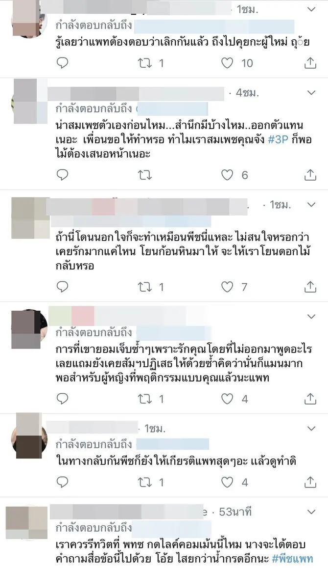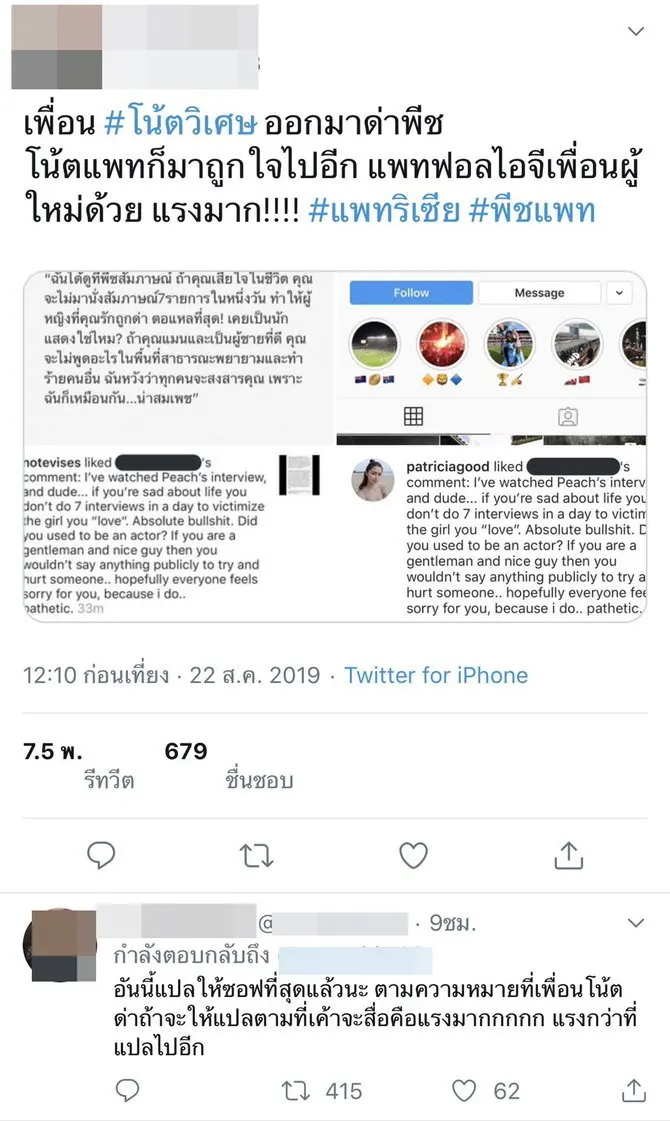 และในเวลาต่อมาคนก็รีทวีตข้อความนี้เยอะมาก และคำถามของชาวเน็ตที่ตามมาว่าเพื่อนโน้ตคอมเมนต์แรงไปมั้ย? เพราะพีชก็ออกงานเพื่อโปรโมตหนังเท่านั้น และให้สัมภาษณ์ตามที่ทุกคนเห็นคือดีและไม่ได้ใส่ร้ายใคร ส่วนทางแพทริเซียก็ได้กดติดตามเพื่อนของโน้ตด้วย ซึ่งล่าสุดข้อความที่โน้ตโพสต์ชี้แจงนั้นก็ได้ถูกลบออกไปแล้ว
