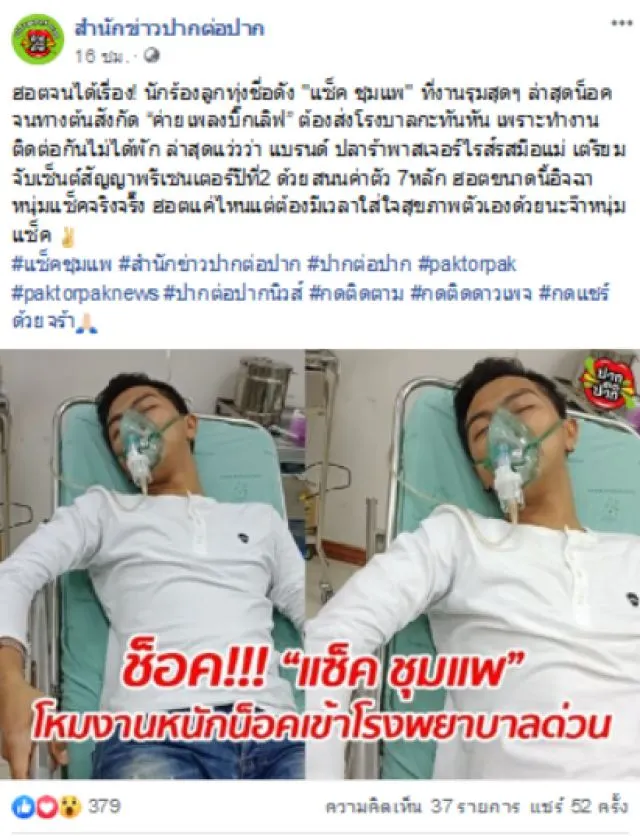 เชื่อว่าหลายคนคงรู้จักกันเป็นอย่างดี สำหรับนักร้องหนุ่มมากความสามารถอย่าง แซ็ค ชุมแพ ทราบกันอย่างดีว่าหนุ่ม แซ็ค นั้นทำงานหนักมากๆ ล่าสุดทำเอาแฟนคลับตกใจหนัก เมื่อเพจ สำนักข่าวปากต่อปาก ได้ออกมาโพสต์ภาพพร้อมได้ระบุข้อความว่า ฮอตจนได้เรื่อง! นักร้องลูกทุ่งชื่อดัง "แซ็ค ชุมแพ" ที่งานรุมสุดๆ ล่าสุดน็อคจนทางต้นสังกัด ค่ายเพลงบิ๊กเลิฟ ต้องส่งโรงบาลกะทันหัน เพราะทำงานติดต่อกันไม่ได้พัก ล่าสุดแว่วว่า แบรนด์ ปลาร้าพาสเจอร์ไรส์รสมือแม่ เตรียมจับเซ็นต์สัญญาพรีเซนเตอร์ปีที่2 ด้วยเสนอค่าตัว 7หลัก ฮอตขนาดนี้อิจฉาหนุ่มแซ็คจริงจริ๊ง ฮอตแค่ไหนแต่ต้องมีเวลาใส่ใจสุขภาพตัวเองด้วยนะจ๊ะหนุ่มแซ็ค
