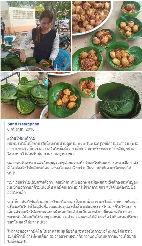 ไม่ว่าจะมองจากมิติใด ในอาหารเมนูเดียวกัน ระหว่างใส่ภาชนะโฟมกับใส่กระทงใบไม้ที่ว่านี้ ถ้าให้ผมเลือก ผมว่าอย่างหลังน่ากินกว่าและมีเสน่ห์กว่าอย่างเทียบกันไม่ติดละครับ