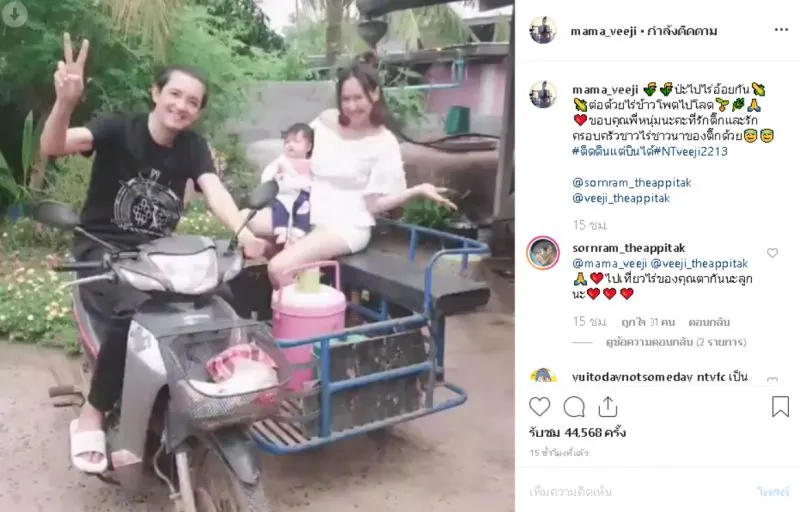 ต่อมา หนุ่ม ศรราม ก็เข้าไปคอมเมนต์ว่า คุณตายิ้มทั้งวันเลยได้อุ้มวีจิซะทีนะครับ ด้วยความรักและเคารพนะครับคุณพ่อ ก่อนที่ ติ๊ก จะโพสต์อีกภาพ ขณะสามี ขี่มอเตอร์ไซค์พ่วงข้าง ที่ตัวเองนั่งอุ้มลูกอยู่ พร้อมแคปชั่นว่า