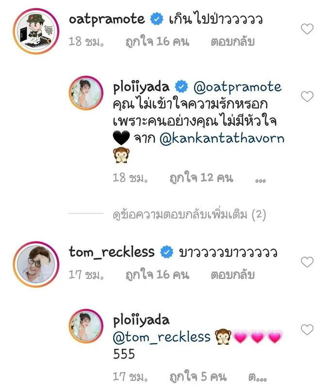 และก็แน่นอนว่า หลังจากที่ภาพถ่ายนี้ถูกโพสต์ลงบนอินสตาแกรมได้ไม่นาน ก็มีเพื่อนๆ ซุปตาร์จำนวนไม่น้อย อาทิ เสนาลิง, โอ๊ต ปราโมทย์, นิวเคลียร์ หรรษา, ทอม อิศรา ฯลฯ เข้ามาสาดคอมเมนต์ทั้งฟินฮาใส่ทั้งคู่แบบรัวๆ
