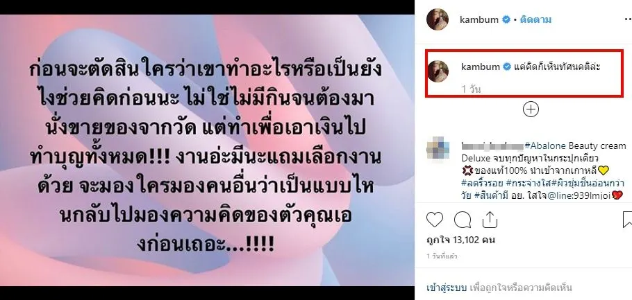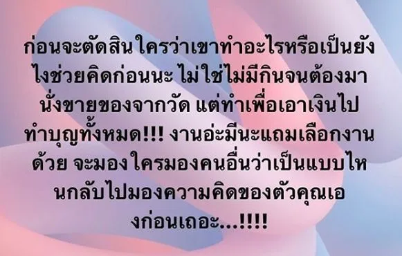 “ก่อนจะตัดสินใครว่าเขาทำอะไรหรือเป็นยังไง ช่วยคิดก่อนนะ ไม่ใช่ไม่มีกินจนต้องมานั่งขายของจากวัด แต่ทำเพื่อเอาเงินไปทำบุญทั้งหมด !!! งานอ่ะมีนะแถมเลือกงานด้วย จะมองใครมองคนอื่นว่าเป็นแบบไหน กลับไปมองความคิดของตัวคุณเองก่อนเถอะ… !!!”