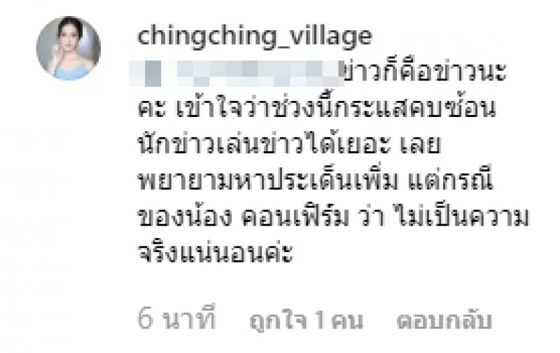 อย่างไรก็ตาม ทางด้าน สาวชิงชิง ได้คอมเมนต์ตอบชาวเน็ตว่า ข่าวก็คือข่าวนะคะ เข้าใจว่าช่วงนี้กระแสคบซ้อน นักข่าวเล่นข่าวได้เยอะ เลยพยายามหาประเด็นเพิ่ม แต่กรณีของน้อง คอนเฟิร์ม ว่า ไม่เป็นความจริงแน่นอนค่ะ