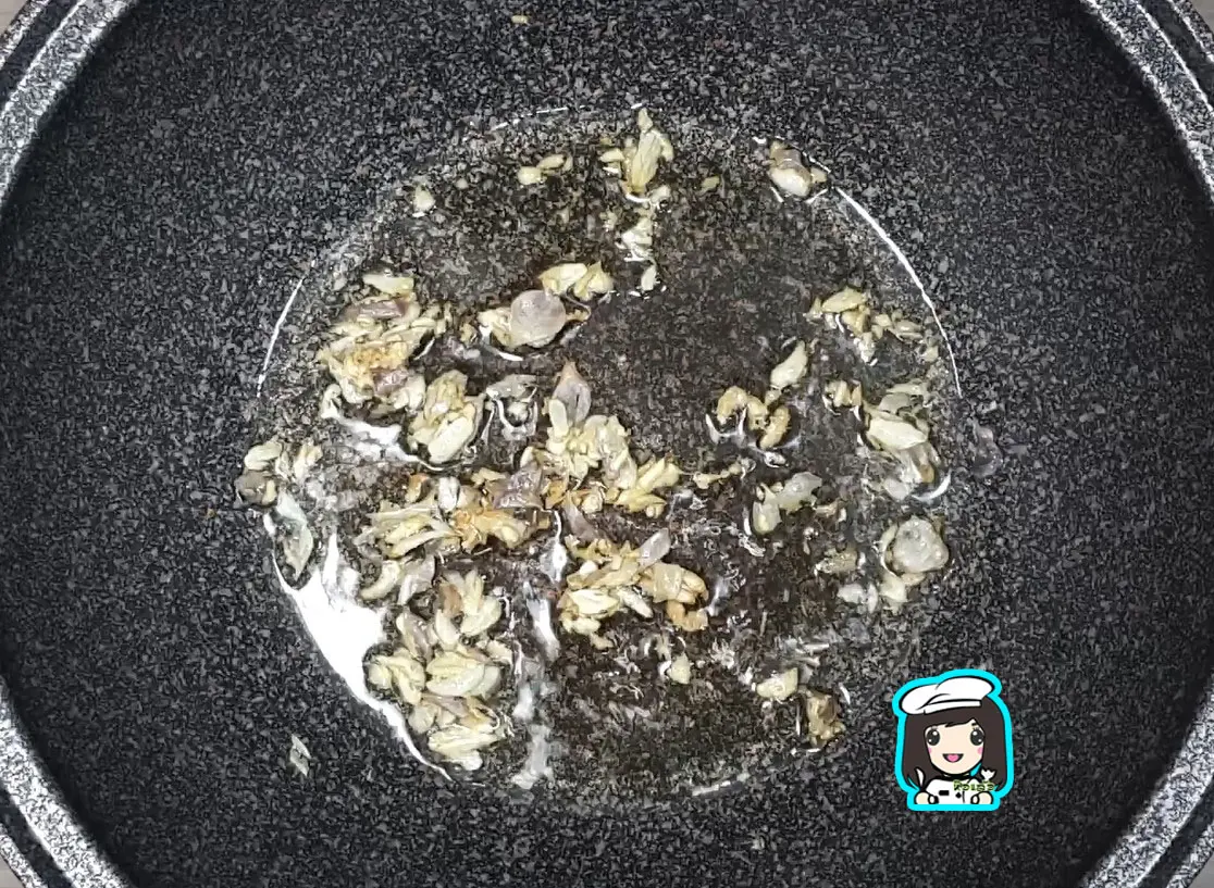 2.โขลกกระเทียมลงเจียวกับน้ำมันให้หอม เริ่มเหลืองตักกระเทียมขึ้นพักไว้ ตักน้ำมันที่เจียวกระเจียมแยกไว้ 1 ชต.