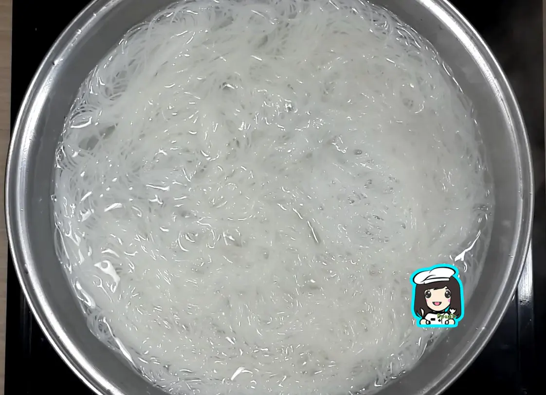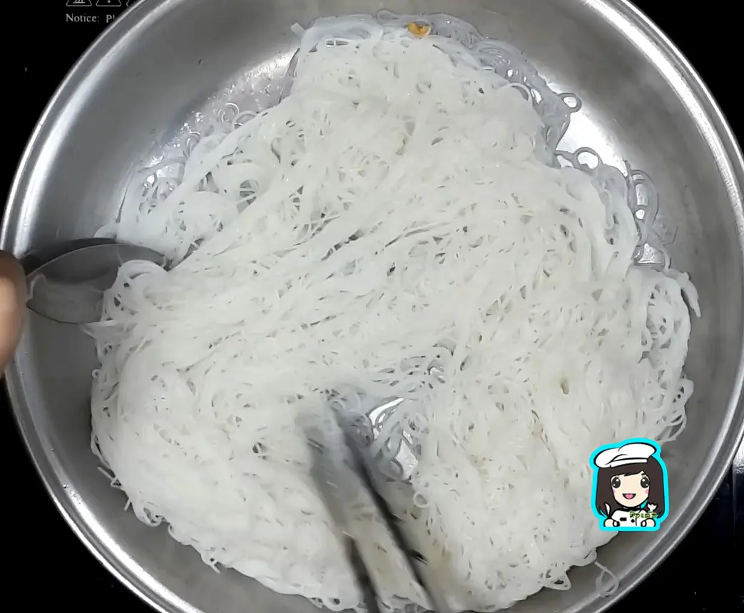 3.ตั้งน้ำให้ร้อนใส่เส้นหมี่ที่แช่น้ำไว้ลงไปลวกประมาณ 1-2 นาที ตักขึ้นให้สะเด็ดน้ำ