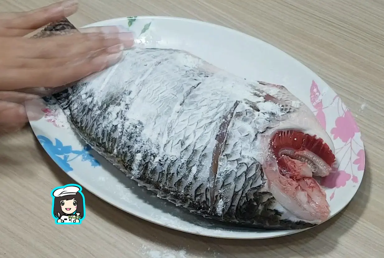 4.ตั้งกระทะใส่น้ำมันเพิ่มให้เยอะขึ้น กะให้ท่วมตัวปลา ก่อนทอดซับตัวปลาด้วยทิชชู่ให้เนื้อปลาแห้ง โรยด้วยแป้งทอดกรอบให้ตัวทั่วทั้งตัวปลา