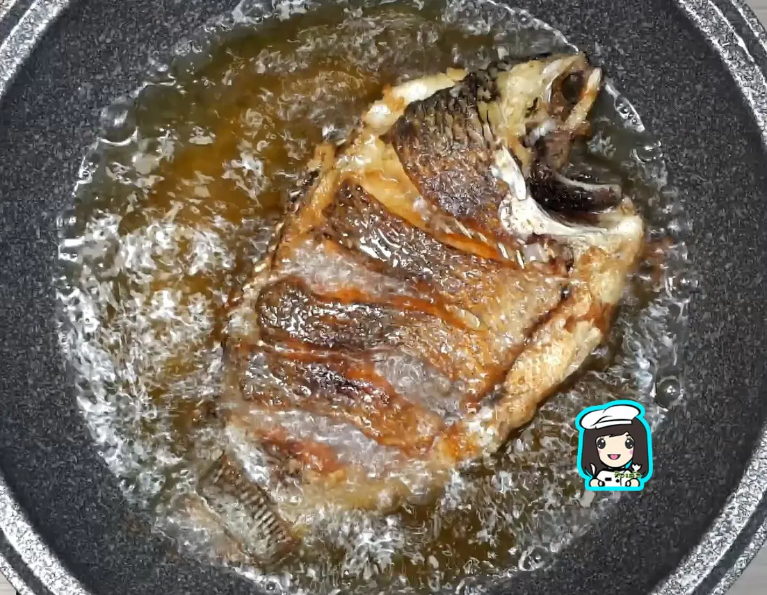 น้ำมันเริ่มร้อนใส่ปลาลงทอด ใช้ไฟกลางอ่อนไปทางอ่อน ทอดให้สุกที่ละด้าน สุกดีแล้วเร่งไฟให้แรงขึ้นเพื่อให้เนื้อปลาด้านนอกกรอบ ตักขึ้นพักให้สะเด็ดน้ำมัน