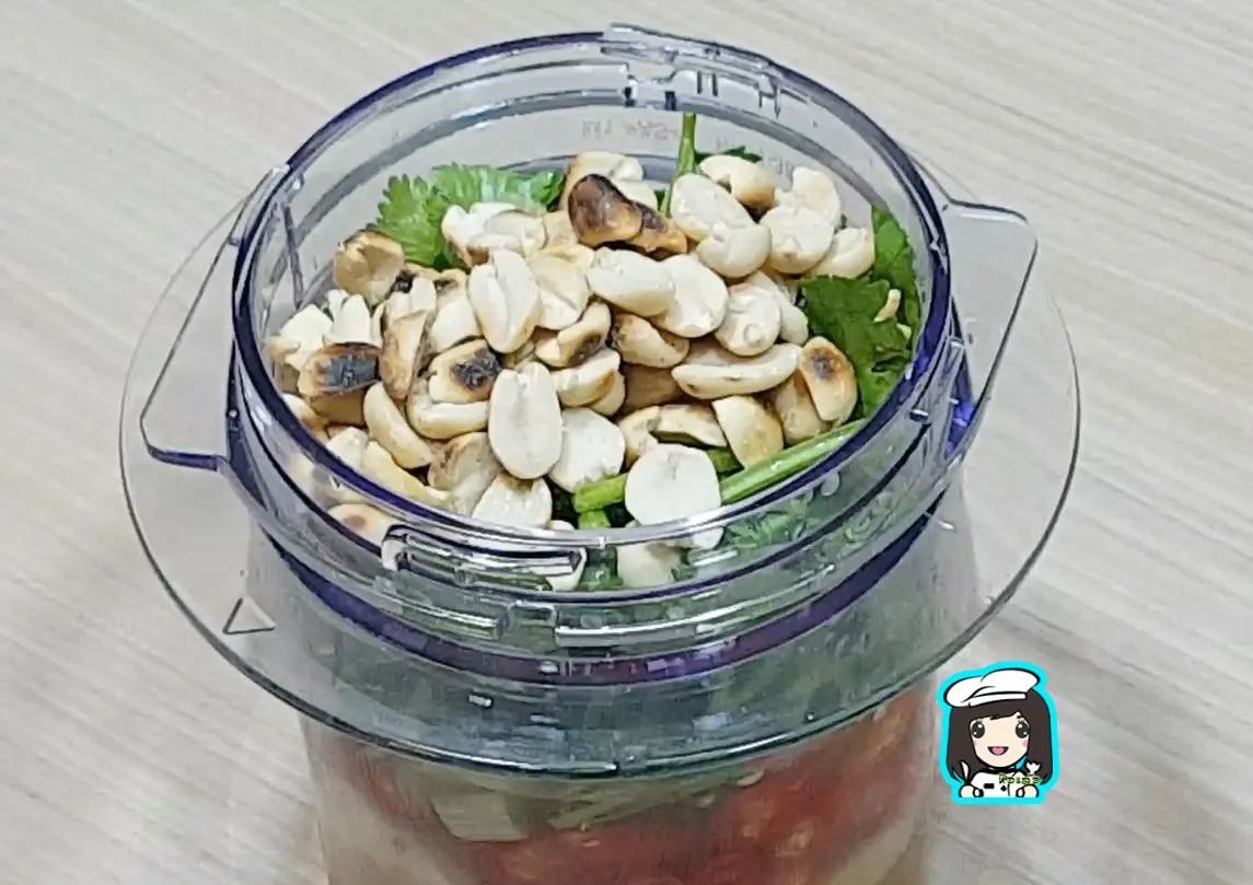 5.ระหว่างที่ทอดปลา ทำน้ำจิ้มถั่ว เริ่มจากนำน้ำตาลละลายกับน้ำเปล่าเข้าไมโครเวฟเพื่อให้ละลายเร็วขึ้นและเพิ่มความเหนียวเป็นน้ำเชื่อม ใส่น้ำปลา น้ำมะนาว น้ำเชื่อม เกลือป่น ลงในโถ่ปั่น ชิมรสตามชอบ แล้วค่อยใส่พริก กระเทียม รากและต้นผักชีที่หั่นหยาบๆ ถั่วคั่วลงไป