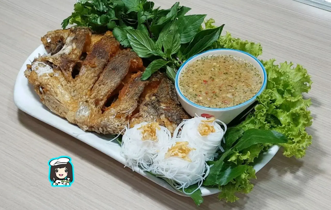 6.จัดปลาทอดและเส้นหมี่ใส่จาน ทานคู่กับน้ำจิ้มถั่วแกล้มผักสดตามชอบ