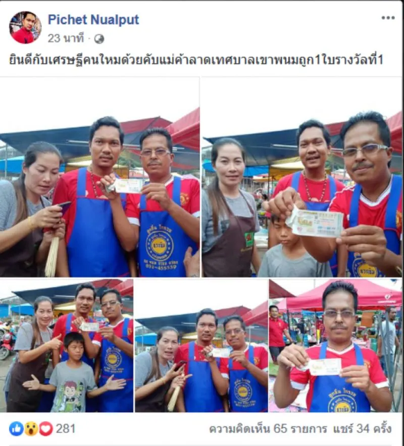 ล่าสุดผู้สื่อข่าวสยามนิวส์รายงานว่า โลกออไนลน์มีการแชร์ภาพน่ายินดีของผู้ใช้เฟซบุ๊กชื่อ Pichet Nualput ที่ได้โพสต์ภาพแสดงความดีใจกับผู้ใชคดีถูกรางวัลโดยระบุข้อความว่า ยินดีกับเศรษฐีคนใหมด้วยคับแม่ค้าลาดเทศบาลเขาพนมถูก1ใบรางวัลที่1