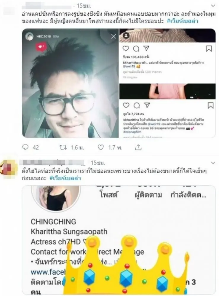 กรณี เวียร์ ศุกลวัฒน์ กับ ชิงชิง คริษฐา หลังมีดราม่าสนั่นเรื่องพระเอกคบซ้อน ซึ่ง ชิงชิง ออกมาชี้แจงก่อนหน้านี้ว่า ลงรูปเหมือน เวียร์ เพราะไปเที่ยวกลุ่มแก๊งเดียวกัน ซึ่งก็มี เบลล่า ไปด้วย