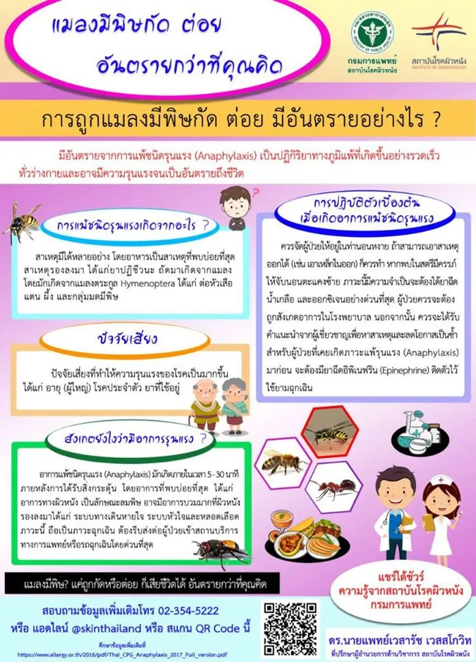 นพ.สมศักดิ์ อรรฆศิลป์ อธิบดีกรมการแพทย์ เปิดเผยว่า จากกรณีการเสนอข่าว แม่ค้าส้มตำที่ อ.เมือง จ.พัทลุง ถูกผึ้งต่อยหน้าบวม ถอดเหล็กในออกแล้วไม่ไปโรงพยาบาล สุดท้ายเสียชีวิตนั้น จากข้อมูลดังกล่าว ผู้ป่วยอาจเกิดอาการแพ้ชนิดรุนแรง เป็นปฏิกิริยาทางภูมิแพ้ที่เกิดขึ้นอย่างรวดเร็วทั่วร่างกาย และอาจมีความรุนแรง จนเป็นอันตรายถึงชีวิต ในประเทศไทย พบ 0.19 คนต่อผู้ป่วยในแสนคน สามารถเป็นซ้ำได้ 1 รายต่อผู้ป่วย 12 รายต่อปี ,สาเหตุมีได้หลายอย่าง โดยอาหารเป็นสาเหตุที่พบบ่อยที่สุด สาเหตุรองลงมา ได้แก่ยาปฏิชีวนะ ถัดมาเกิดจากแมลง โดยมักเกิดจากแมลงตระกูล Hymenoptera ได้แก่ ต่อหัวเสือ แตน ผึ้ง และกลุ่มมดมีพิษ