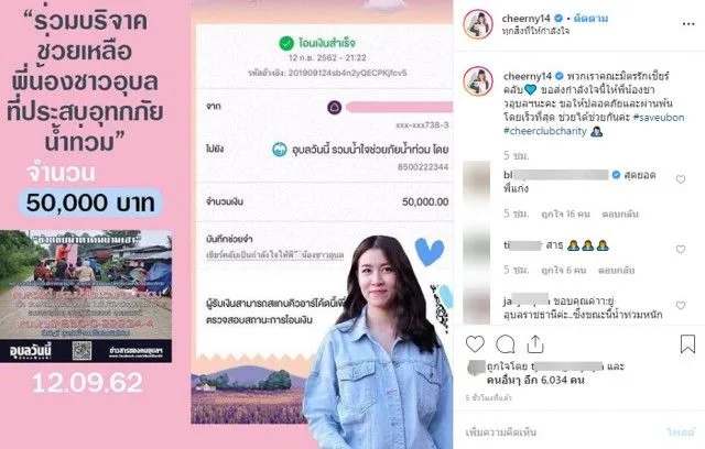 ล่าสุด นางเอกสาว เชียร์ ฑิฆัมพร ฤทธิ์ธาอภินันท์ ได้ร่วมบริจาคเงินเพื่อช่วยเหลือพ่อแม่พี่น้องผู้ประสบภัยในจังหวัดอุบลราชธานี เป็นจำนวนเงิน 50,000 บาท โดยสาวเชียร์ได้โพสต์ว่า...