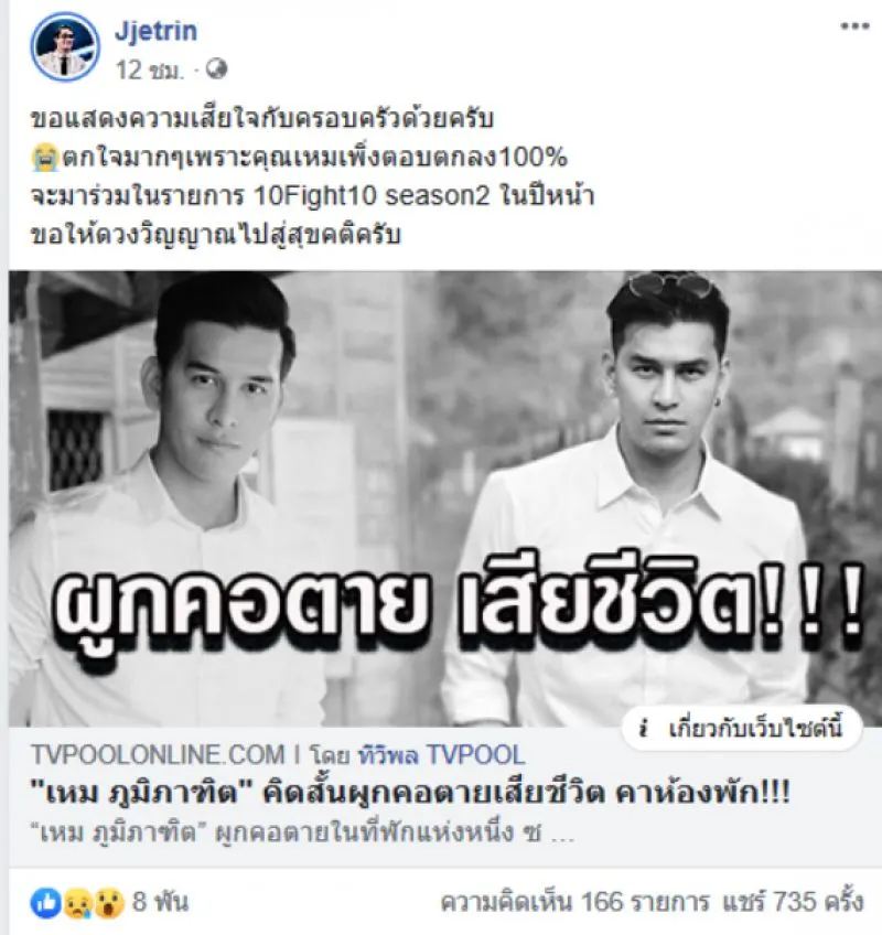 ยังคงเป็นข่าวช็อกที่ทำให้หลายคนแทบไม่อยากจะเชื่อเกี่ยวกับการจบชีวิตกะทันหันของ นักแสดงดังอย่าง เหม-ภูมิภาฑิต นิตยารส ซึ่งเหล่าเพื่อนพี่น้องร่วมวงการก็ออกมาแสดงความเสียใจ ไม่เว้นแม้แต่ เจ-เจตริน วรรธนะสิน ที่ได้ออกมาเผยเพิ่มเติมว่า เหม เตรียมเข้าร่วมรายการ 10 Fight 10 ในซีซั่นหน้าอีกด้วย