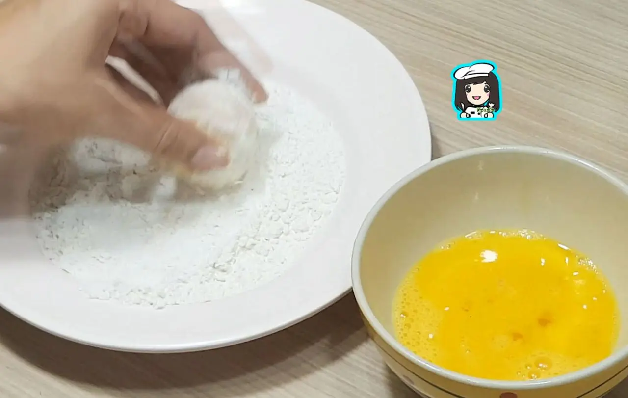 3.หั่นเต้าหู้ไข่เป็นท่อนๆคลุกกับแป้งทอดกรอบแล้วนำชุบไข่ไก่แล้วนำมาคลุกกับแป้งทอดกรอบอีกรอบ