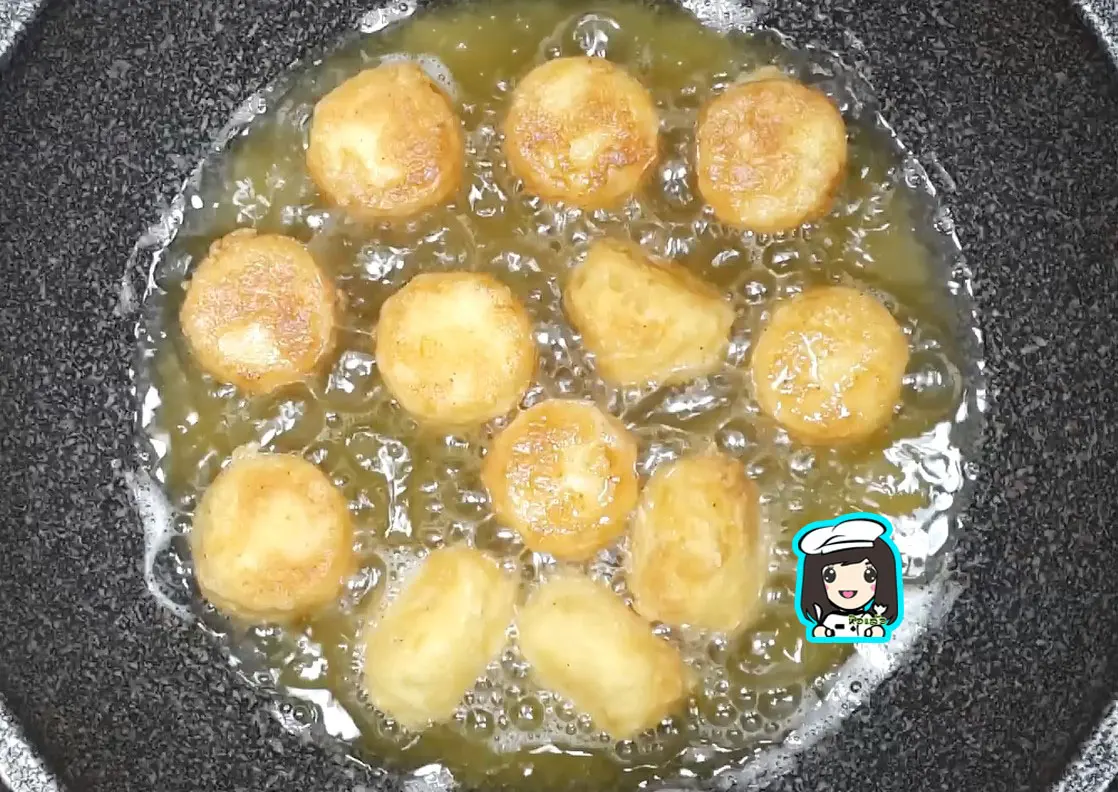 3.ตั้งกระทะใส่น้ำมันค่อนข้างเยอะ ค่อยๆใส่เต้าหู้ที่คลุกแป้งลงไปทอดด้วยไฟอ่อน ทอดจนเริ่มเหลืองเร่งไฟเพื่อรีดน้ำมันตักขึ้นพักให้สะเด็ดน้ำมัน